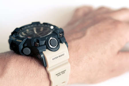 Close up black analog-digital hybrid sports wristwatch. Casual accessory for men.