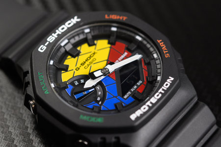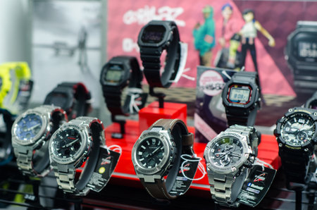 BANGKOK, THAILAND - JANUARY 13, 2020: Casio G-Shock model GA-100-1A1, black sports wristwatch with other Casio G-Shock series. G-Shock is a line of watches manufactured by Casio.