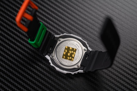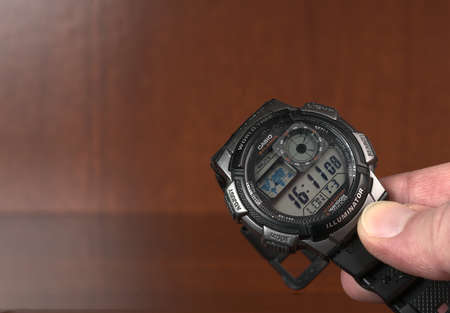 MOSCOW, RUSSIA-October 17, 2021: Casio sports watch in hand on a mahogany closeup background. Space for text