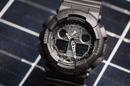 BANGKOK, THAILAND - JANUARY 09, 2020: Casio G-Shock model GA-100-1A1, black sports wristwatch. G-Shock is a line of watches manufactured by Casio.