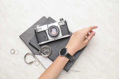 Female hand with stylish wristwatch, photo camera and jewelry on light background