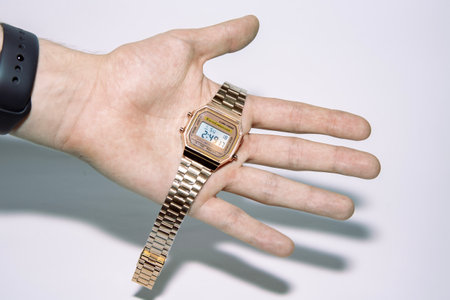 Golden watch with electronic dial on human palm. Electronic watch with golden bracelet. Wristwatch.