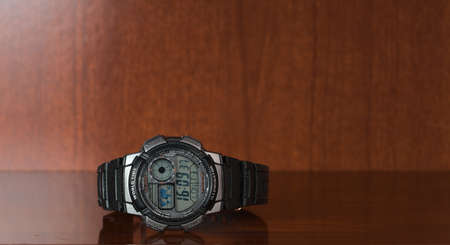 MOSCOW, RUSSIA-October 17, 2021: Casio sports wristwatches lie on a mahogany background. Space for text