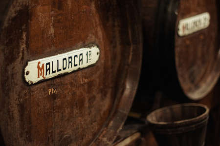 Production of fortified jerez, xeres, sherry wines in old dark oak barrels in sherry triangle, Jerez la Frontera, El Puerto Santa Maria and Sanlucar Barrameda Andalusia, Spain