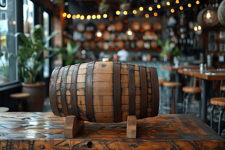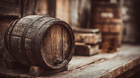 A wooden wine barrel rests on a wooden surface in an old barn, surrounded by rustic decor that creates a warm and inviting scene.