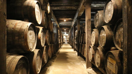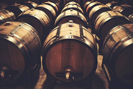 Oak barrels aging wine or whiskey, stacked in rows in a cellar