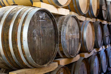 Aging process of cognac spirit in old dark French oak barrels in cool cellar in distillery house, Cognac white wine region, Charente, Segonzac, Grand Champagne, France
