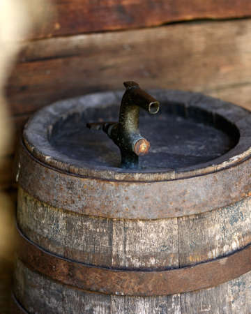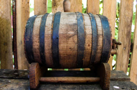 storage, container and object concept - close up of old wooden barrel with rusty hoops outdoors
