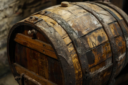 Close-up view of aged wooden barrels used for storing and aging wine in a dark cellar