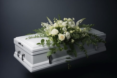 Funeral Elegance: Close-up of Black Casket and White Floral Arrangement