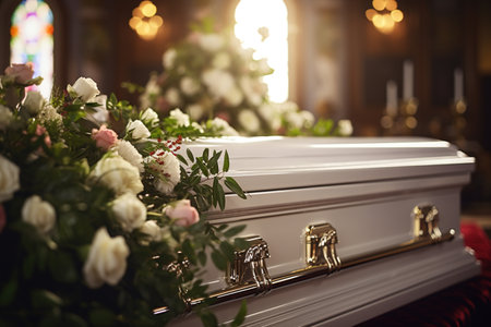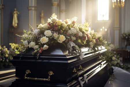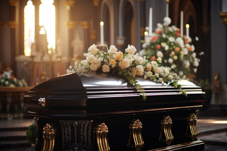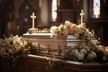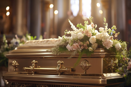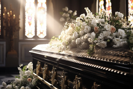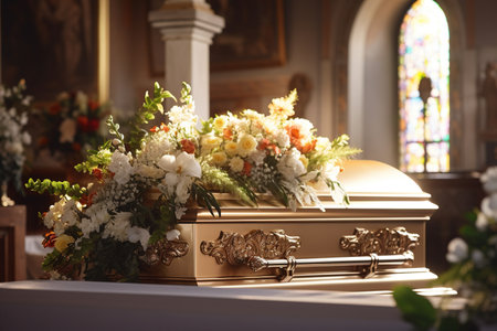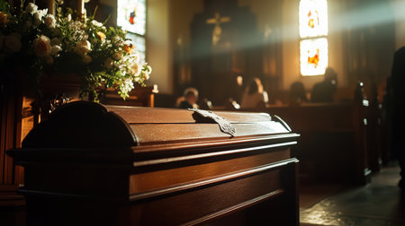 Delicate floral displays adorn a wooden casket, bathed in gentle light within a sacred space, evoking a mood of reverence and quiet mourning.