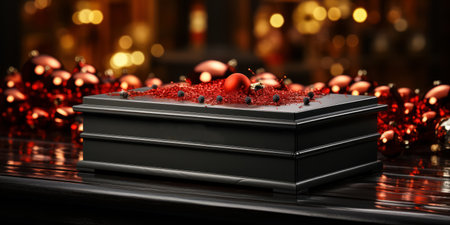 a casket is placed in a gothic-style wooden room adorned with red lamps. the room exudes an atmosphere of darkness and ornate beauty, with dark bronze and gold accents. soft edges and blurred details add to the mysterious ambiance. elaborate drapery surrounds the casket, showcasing timeless artistry. this image carries political and social commentary, featuring skeletal elements. ai generated