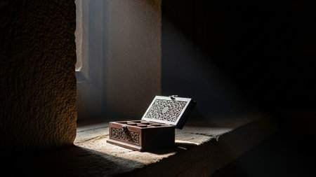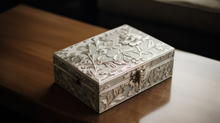 In the dim light of a forgotten room, an ornate vintage jewelry box rests on rich velvet. Its intricate silver details hint at a long history of secrets, heirlooms, and untold stories, waiting to be discovered.