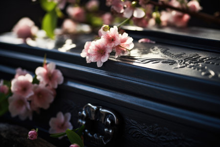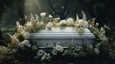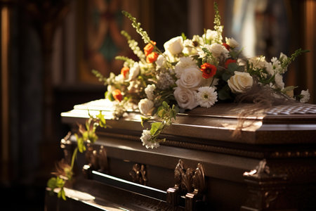 Generative AI, Flowers on a coffin in the funeral or burial services at cemetery, casket with flowers