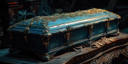 an old and rusty blue wooden coffin is placed in front of a rickety door, creating a dark and brooding atmosphere. this tabletop photograph showcases the intricate ceiling designs and is captured in a style reminiscent of a sanctuary. the dark black and amber tones add to the overall dramatic effect of this staged photography. ai generated