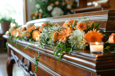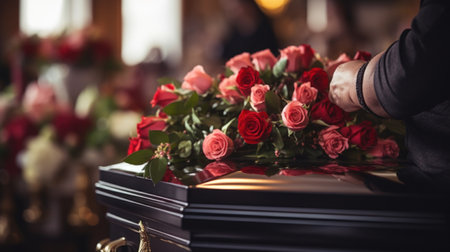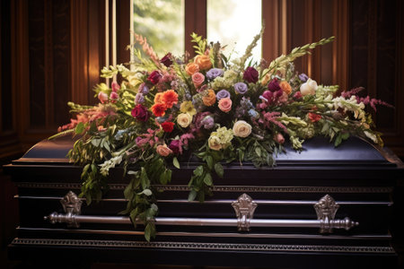 Emotional farewell at a funeral service with a beautifully arranged floral tribute on a polished wooden casket in a solemn atmosphere