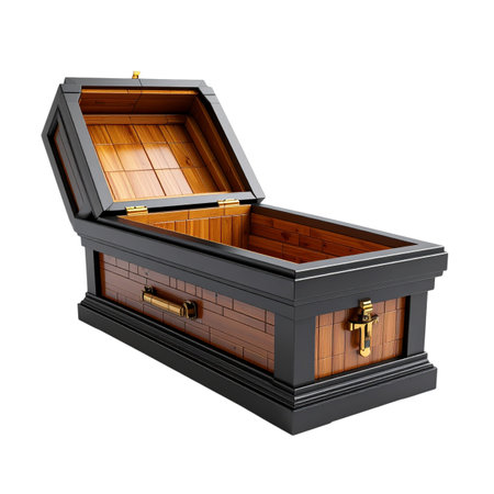 A black coffin with gold trim sits on a grey surface. The coffin is ornate and has a creepy appearance