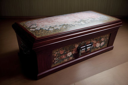 a wooden casket, colorized in darktable processing, is placed in a sunlit setting. candles surround the casket, creating a warm and traditional atmosphere. the realistic figurative details of the foliage add depth to the scene. the casket's red and gold accents enhance its aesthetic appeal. ai generated
