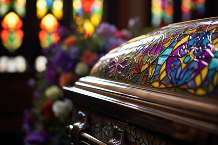 closeup shot of a colorful casket in a hearse or chapel before funeral or burial at cemetery