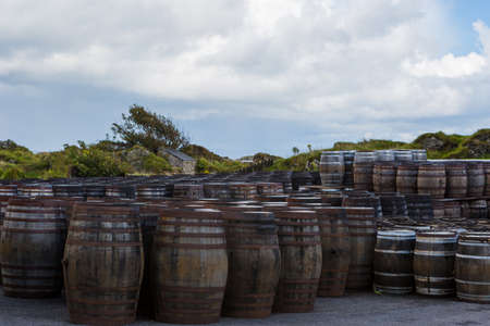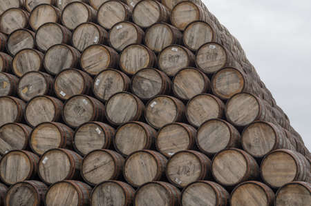 Stacked pile of old wooden barrels and casks at whisky distillery in Scotland.