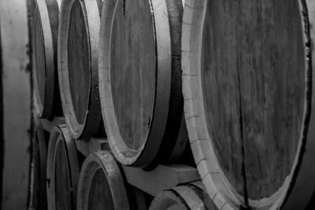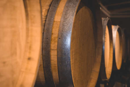Vintage old oak barrels of wine, cognac in the wine dark vaults of the winery. Selective soft focus. Shooting in the dark