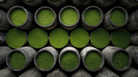 This image showcases an aerial view of several cylindrical containers filled with a lush green substance, presenting a striking pattern and vibrant texture.