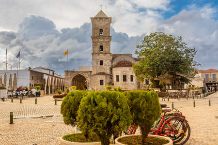 Agia Paraskevi old stone with domes and bell tower Byzantine Church on the central square of Geroskipou village, Cyprus