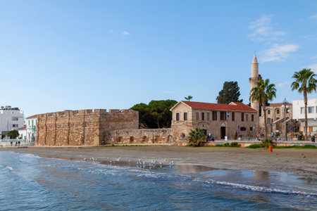 Larnaca, Cyprus - February 17 2024: Larnaca Castle and the Minaret of the Djami Kebir Mosque alongside the mediterranean sea