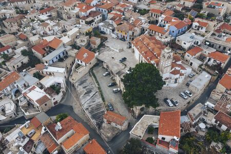 Aerial view of famous landmark valley Pano Lefkara village, Larnaca, Cyprus with orange ceramic roofs, drone photo.