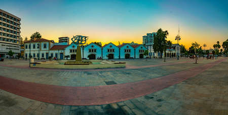 Paphos, Cyprus tropical resort embankment at beautiful colorful sunset. Mediterranean vacations and travel concept, copy space