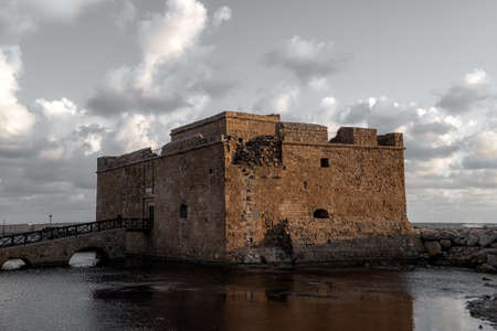 Pafos Harbour Castle, also known as Turkish Castle in Pathos, Cyprus, on a sunset with reflection