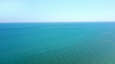 Aerial view of calm sea blue water and sky without clouds. place for text.