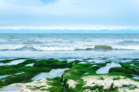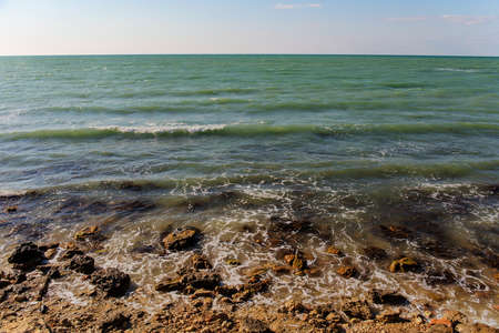 seascape, coast of the Caspian Sea with algae-covered coastal stones