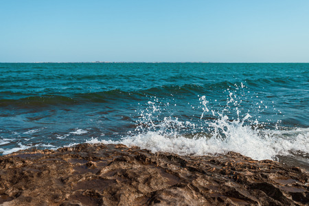 Background with rocky seashore and white surf foam on a summer sunny day.