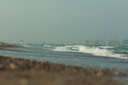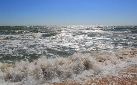Sea shore with surf in the sunny windy day
