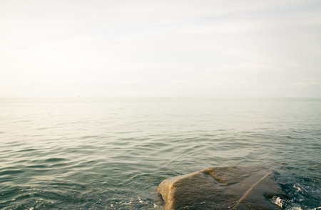 Calm tranquil blue sea with no waves and with foggy backgroudn