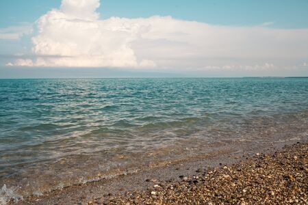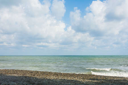 Sea coast with pebbles and blue sky with white clouds.