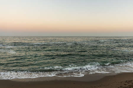 Baltic sea shore (sand dunes) at sunset. Soft sunlight, clear sky with glowing clouds, waves and water splashes. Idyllic seascape. Liepaja, Latvia, Europe. Warm winter weather, climate change, nature