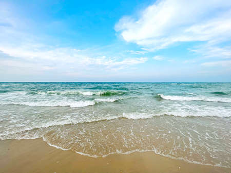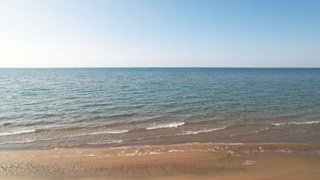 sandy beach and blue sea wave. Beautiful natural background. Tourism and travel