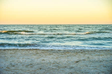 Panoramic view of evening sea with empty beach and sun glares in shining waves