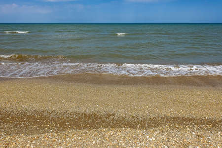 sea wave washes yellow beach of pebbles sea occupies a large area of the picture is in the corner of coast