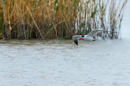 One single caspian tern (Hydroprogne caspia) flys over the marsh at Edwin B. Forsythe National Wildlife Refuge, New Jersey, USA