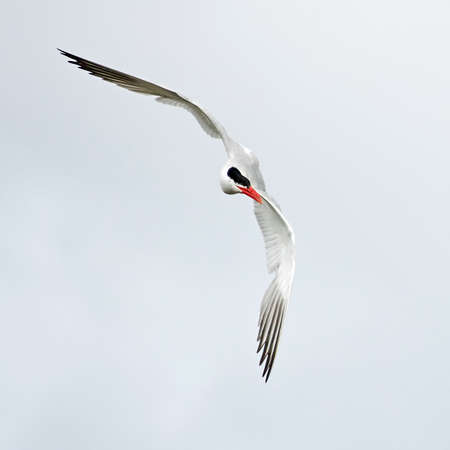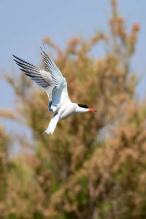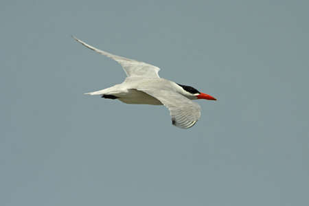 Caspian tern (Hydroprogne caspia) flying in the sky in summer.