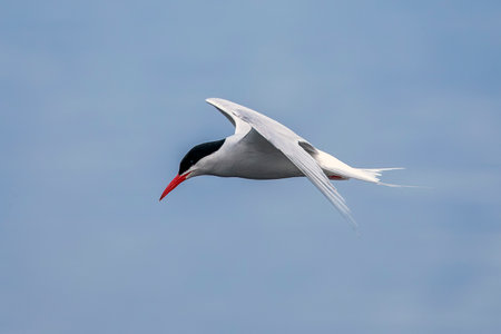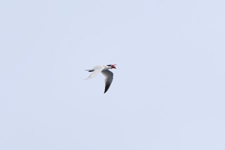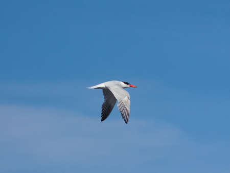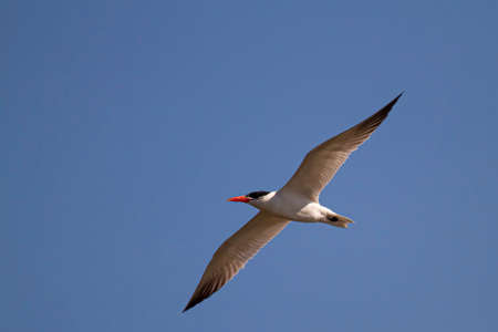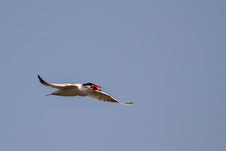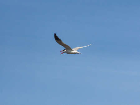 A beautiful Caspian tern flying effortlessly in the blue sky