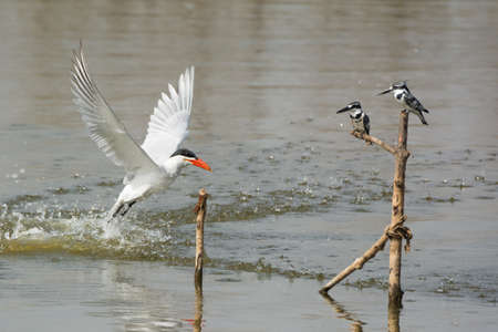 A pair of Pied Kingfishers Ceryle rudis watch as a Caspian Tern Sterna Caspia emerges from the water after a dive