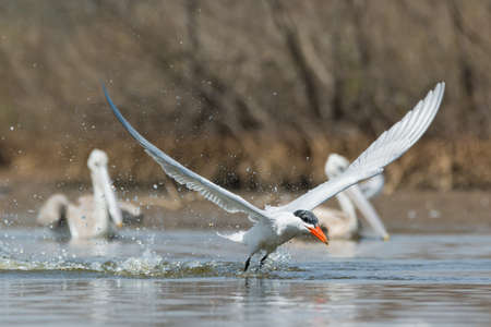 A Caspian Tern (Hydroprogne caspia) taking to the air after a dive in front of two pink-backed pelicans