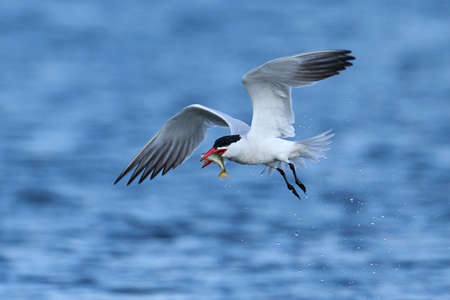 A nonbreeding adult Caspian tern (Hydroprogne caspia) holding a fresh caught fish in its mouth flies over the water at Edwin B. Forsythe National Wildlife Refuge, New Jersey, USA