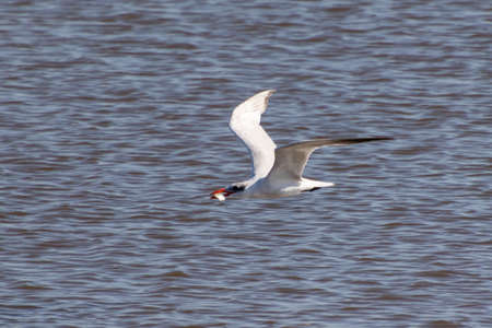 A caspian tern (Hydroprogne Caspia) is flying over the Chesapeake bay around Eastern Neck Island of Maryland, The bird is carrying a fish in its mouth.