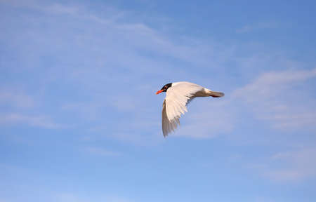 young gull with black head typical of the mediterranean sea flies high in the blue sky