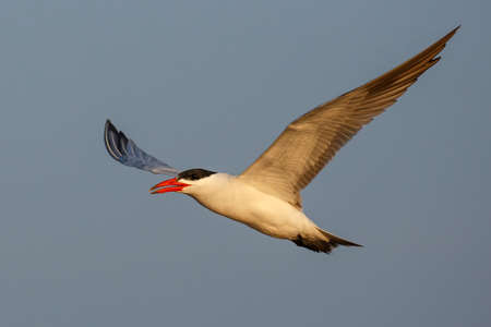Caspian tern, Hydroprogne or Sterna caspia, flight against blue sky, selective focus, shallow DOF.